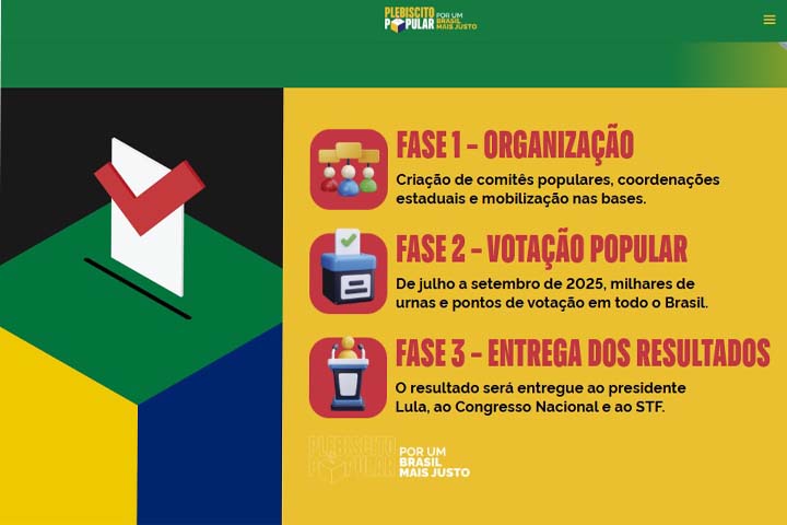 O plebiscito estará aberto para votação de 1º de julho até setembro, permitindo a participação de qualquer pessoa que queira votar ou se voluntariar na coleta de votos. As urnas serão instaladas em pontos de grande circulação, como sindicatos, praças, igrejas, terminais de transporte, escolas, locais de trabalho e outros espaços públicos, facilitando o acesso e incentivando a ampla participação popular.