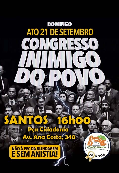 Para quem é da Baixada Santista, informamos que haverá ato, às 16h, na Praça da Cidadania, na Avenida Ana Costa, 340.