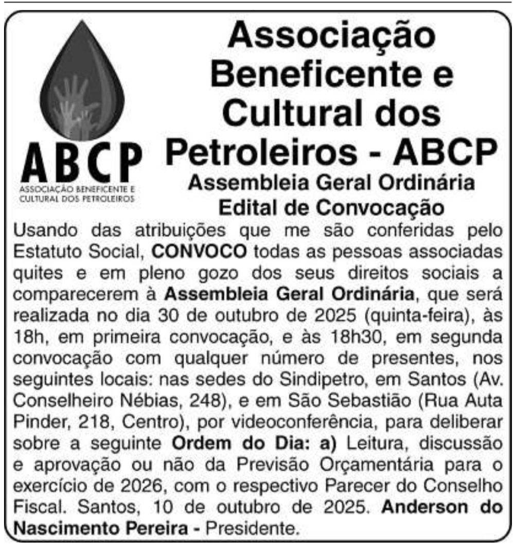 O presidente da Associação Beneficente e Cultura dos Petroleiros - Litoral Paulista (ABCP), Anderson do Nascimento Pereira, no exercício das funções que lhe são atribuídas pelo Estatuto Social, convoca todas as pessoas associadas que estejam quites com suas obrigações e em pleno gozo de seus direitos estatutários para participarem da Assembleia Geral Ordinária (AGO), conforme a convocação a seguir: